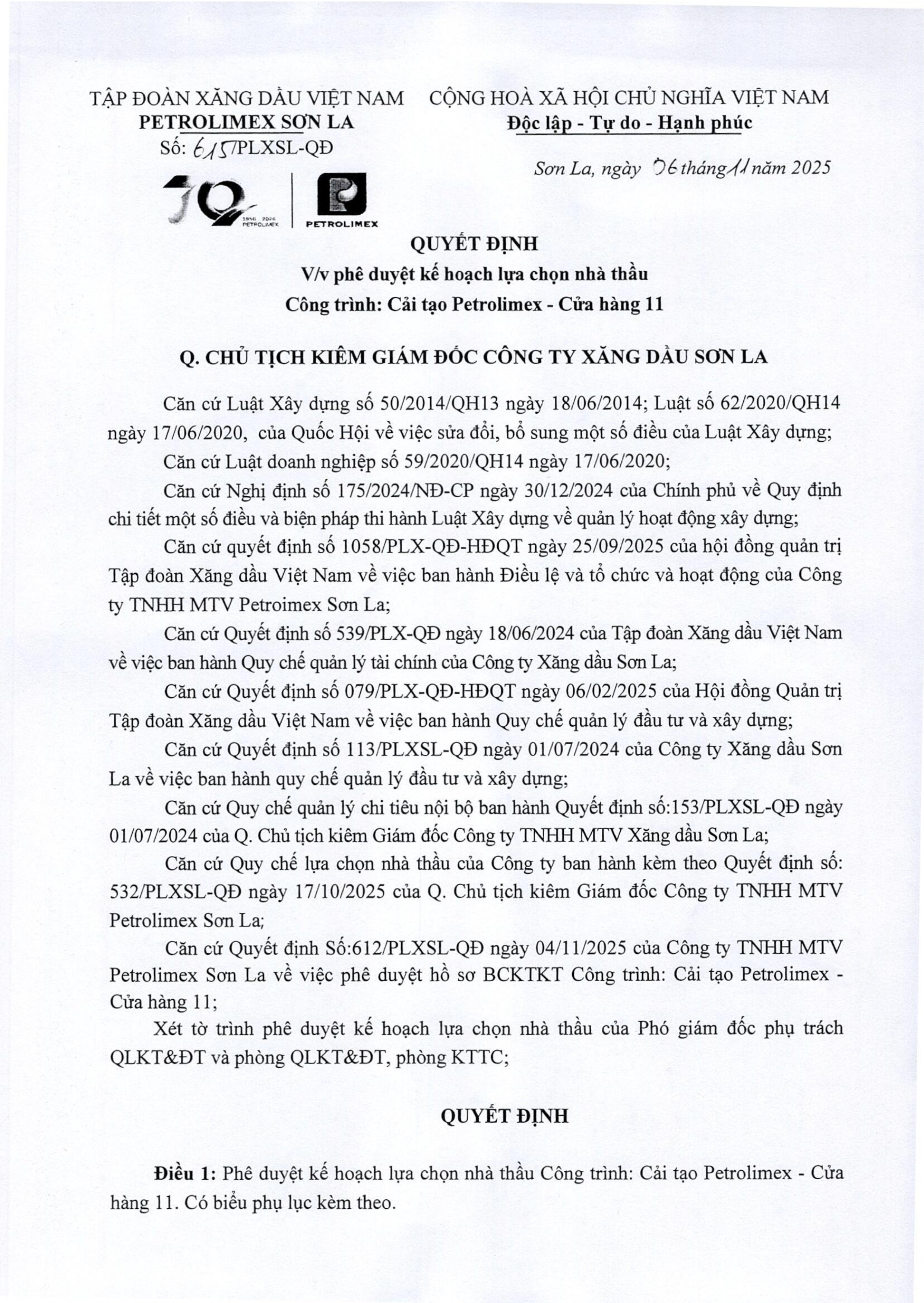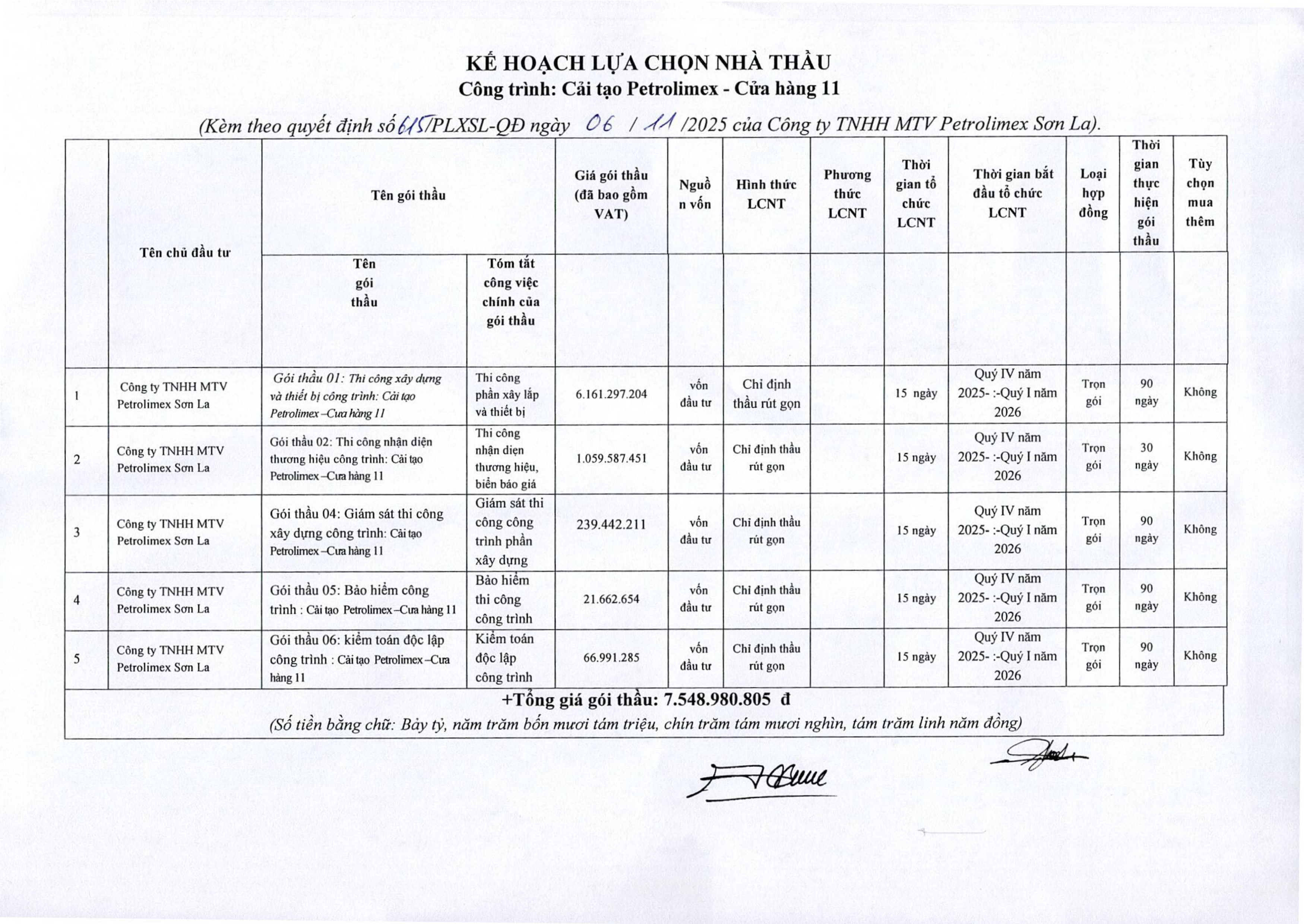 Kế hoạch lựa chọn nhà thầu. Công trình: Cải tạo Petrolimex - Cửa hàng 11