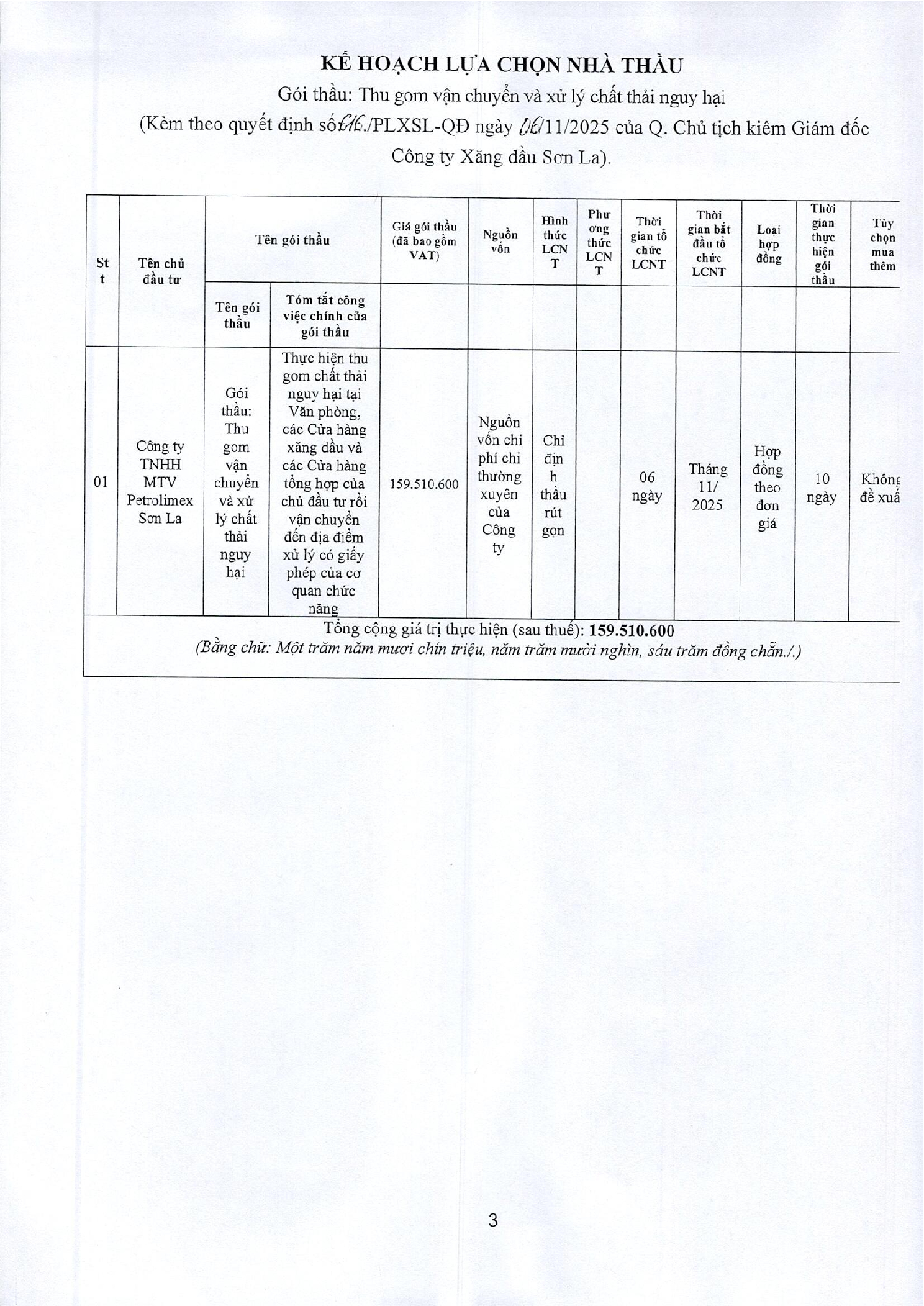 Gói thầu: Thu gom vận chuyển và sử lý chất thải nguy hại