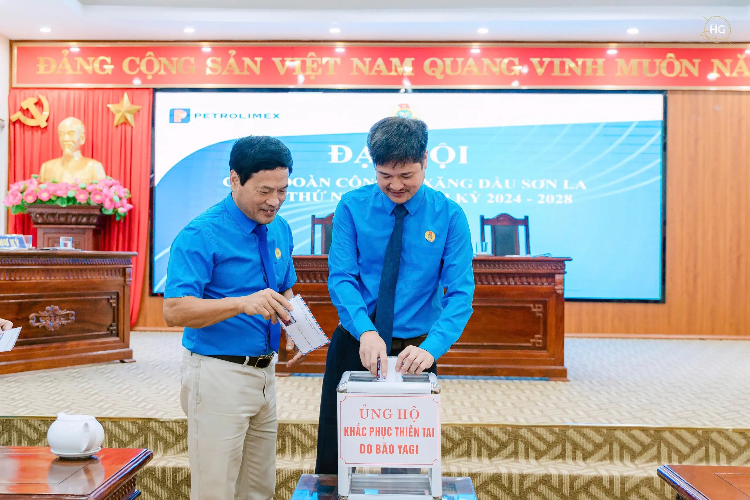 Một nội dung chính thức trong Đại hội là ủng hộ khắc phục thiệt hại do cơn bão số 3 – YAGI và mưa lũ sau bão đã được đoàn Chủ tịch phát động. Từ ngày 06/9 – 10/9/2024 siêu bão YAGI đã để lại hậu quả nặng nề cho các tỉnh phía Bắc. Công đoàn Xăng dầu Việt Nam đã kêu gọi phát huy truyền thống “Tương thân, tương ái” của Petrolimex hỗ trợ đồng bào, nhân dân, người lao động Petrolimex ở các tỉnh phía Bắc chịu ảnh hưởng của bão và mưa lũ sau bão sớm vượt qua khó khăn ổn định cuộc sống. Các Đại biểu tại Đại hội đã nhiệt tình hưởng ứng lời kêu gọi, ngay sau Đại hội các ĐV-NLĐ của Công ty Xăng dầu Sơn La đã ủng hộ 01 ngày lương để chung tay hỗ trợ đồng bào vượt qua khó khăn, với tổng số tiền ủng hộ được trên 70 triệu đồng. Công ty đang tiếp tục kêu gọi, vận động ĐV-NLĐ bằng các hình thức hỗ trợ khác để tiếp thêm sức mạnh cho đồng bào bị thiệt hại.