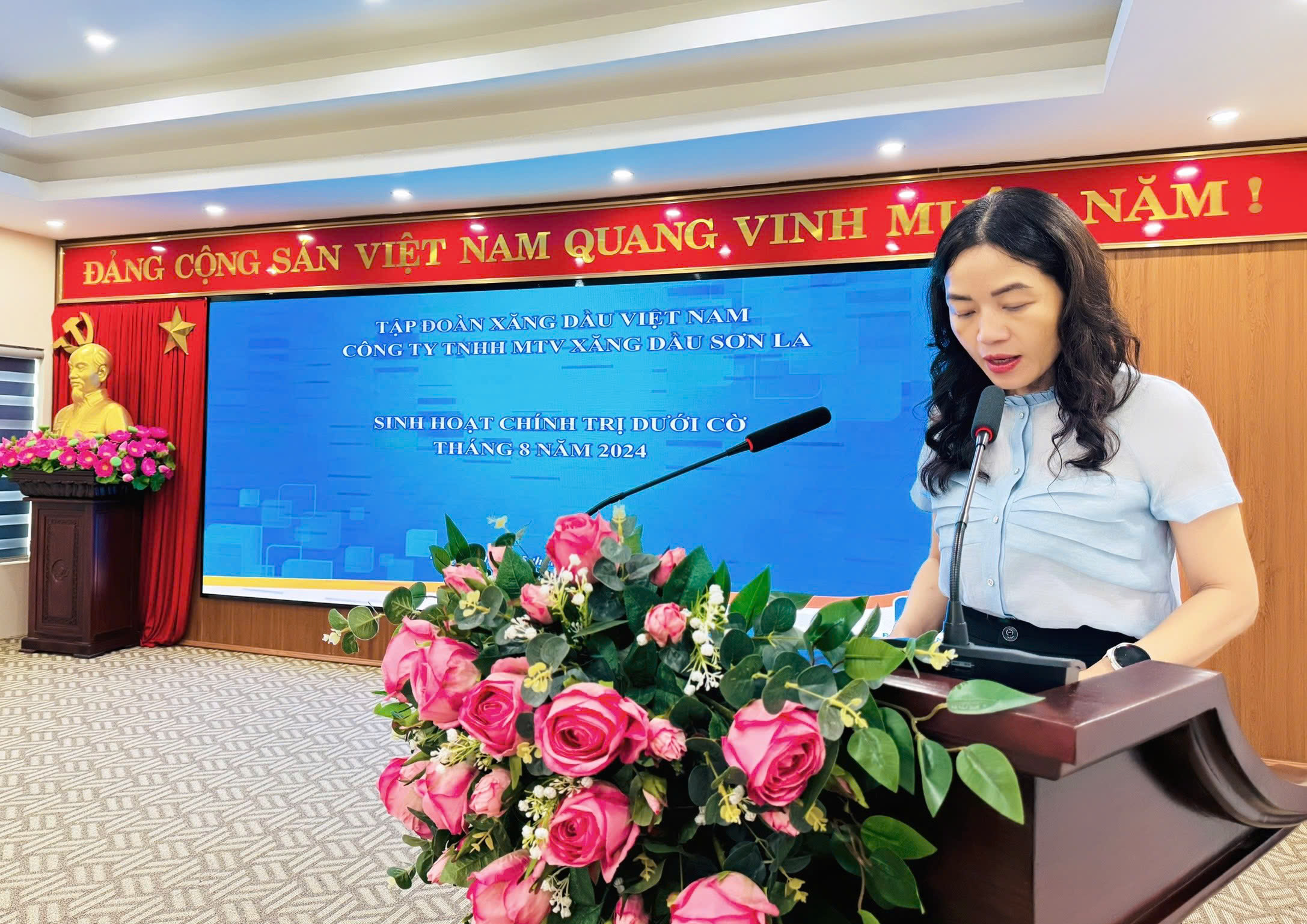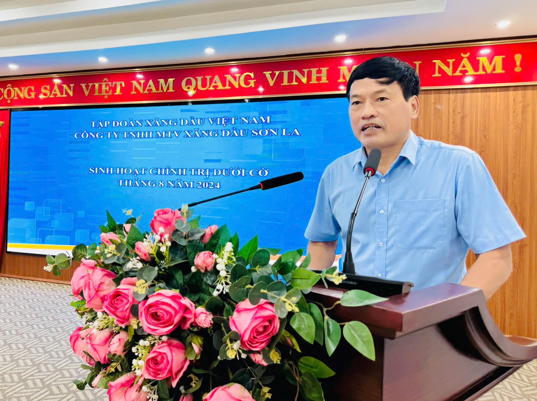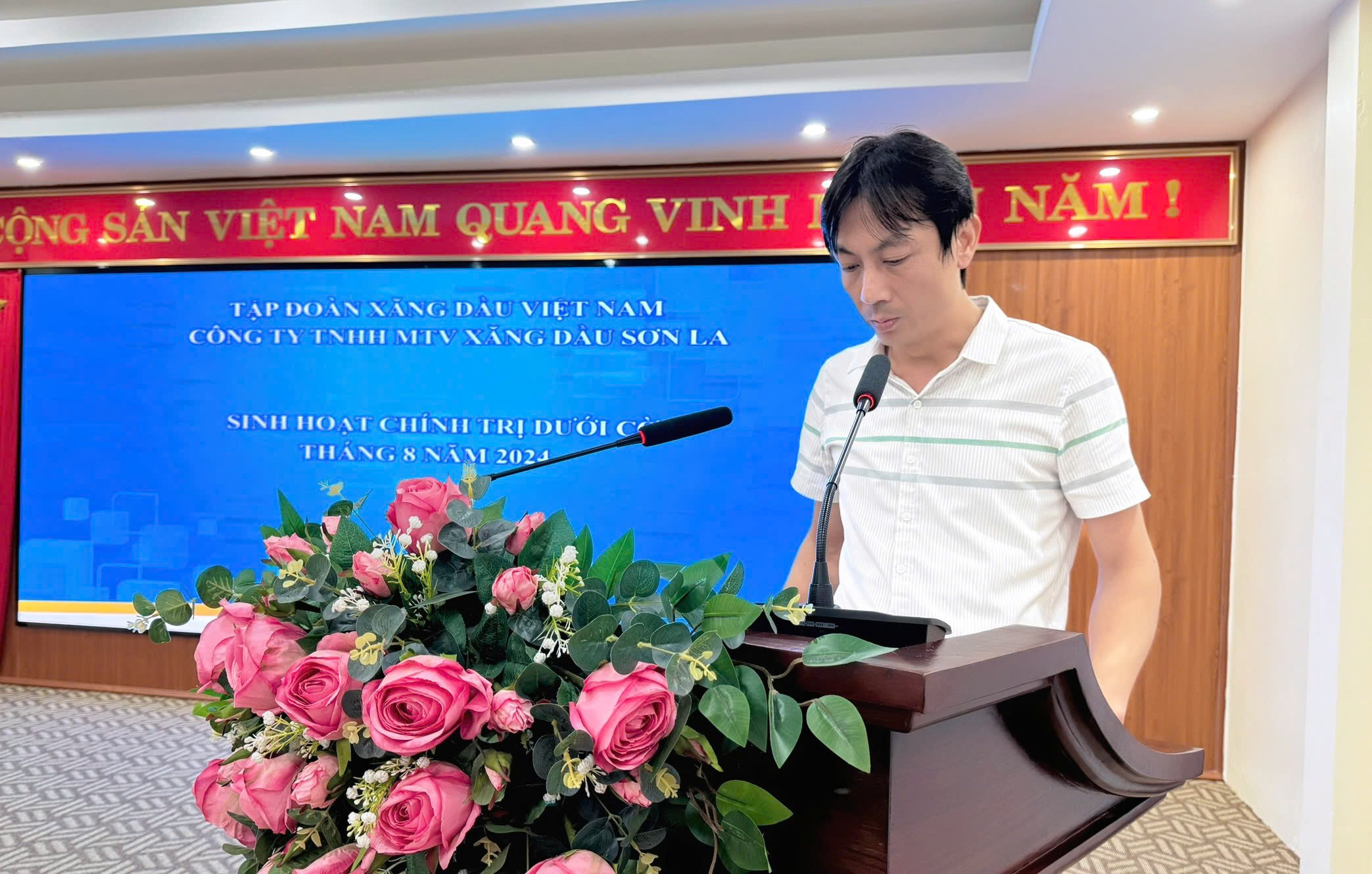 Cũng trong buổi sinh hoạt, Phó Bí thư Đảng ủy Phạm Tuấn Anh đã thông qua những nét chính hoạt động của Công ty trong tháng 7 năm 2024, đồng thời triển khai các nhiệm vụ trọng tâm trong tháng 8 và quý II năm 2024, trong đó tập trung vào triển khai thực hiện tốt kế hoạch SXKD 6 tháng cuối năm 2024 và các nhiệm vụ đã được Tập đoàn Xăng dầu Việt Nam giao trong lễ công bố quyết định thành lập và ra mắt Công ty.