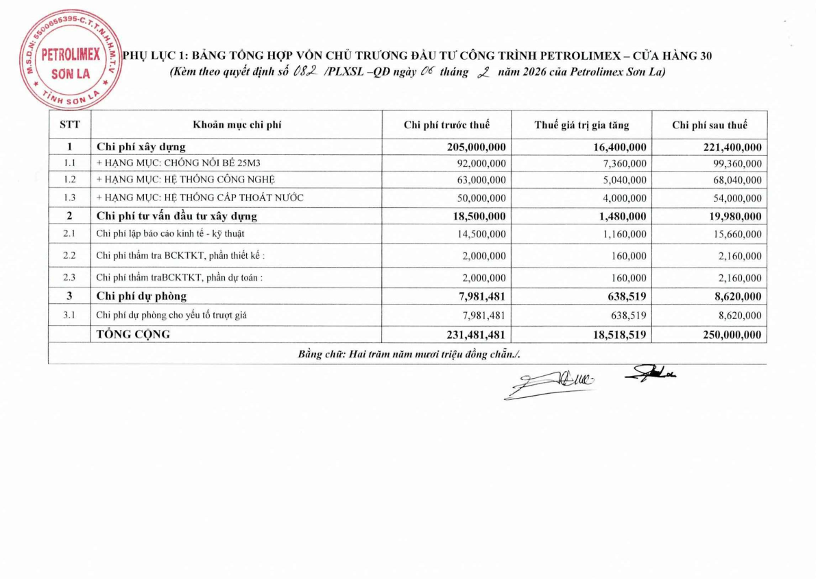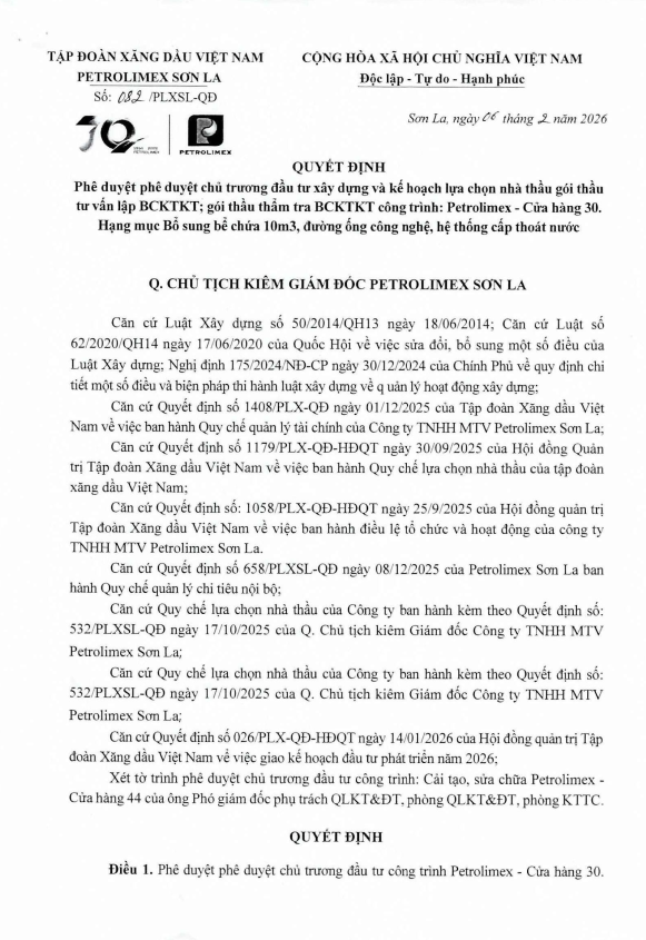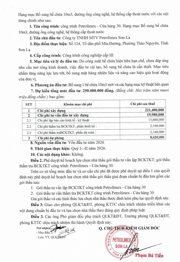 Quyết định phê duyệt chủ trương đầu tư xây dựng và kế hoạch lựa chọn nhà thầu gói thầu tư vấn lập báo cáo KTKT; gói thầu thẩm tra báo cáo KTKT công trình: Petrolimex - Cửa hàng 30. Hạng mục: Bổ sung bể chứa 10m3, đường ống công nghệ , hệ thống cấp thoát nước